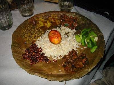 尼瓦風味餐(Newar):白米弄成乾乾的片狀,用辣咖哩調味的馬鈴薯及其他配菜沾著吃;配菜有各式乾豆和生醃肉。特別一提的是,盤子是用樹葉縫製而成的喔!