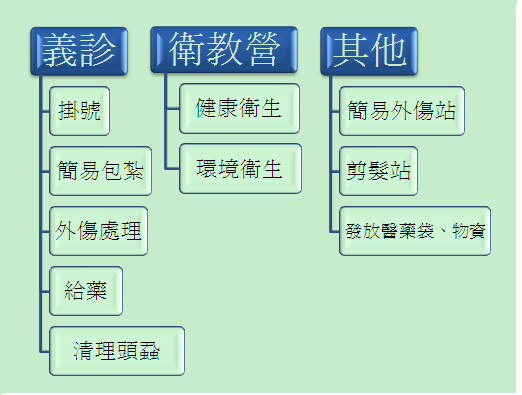 義診的目的是希望藉由此的初步接觸,讓我們更了解當地可能產生的疾病,並且了解當地居民可能存在著的錯誤醫療觀念,有助於我們對於接下來的衛生教育課程進行調整。 2. 建立正確衛生觀念